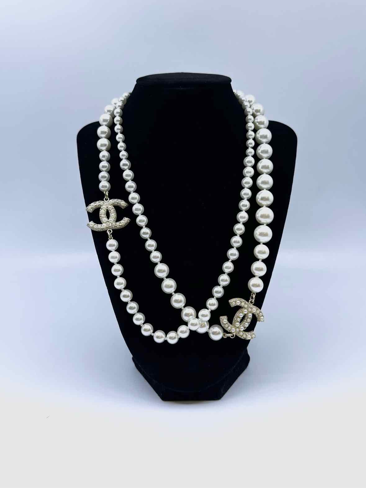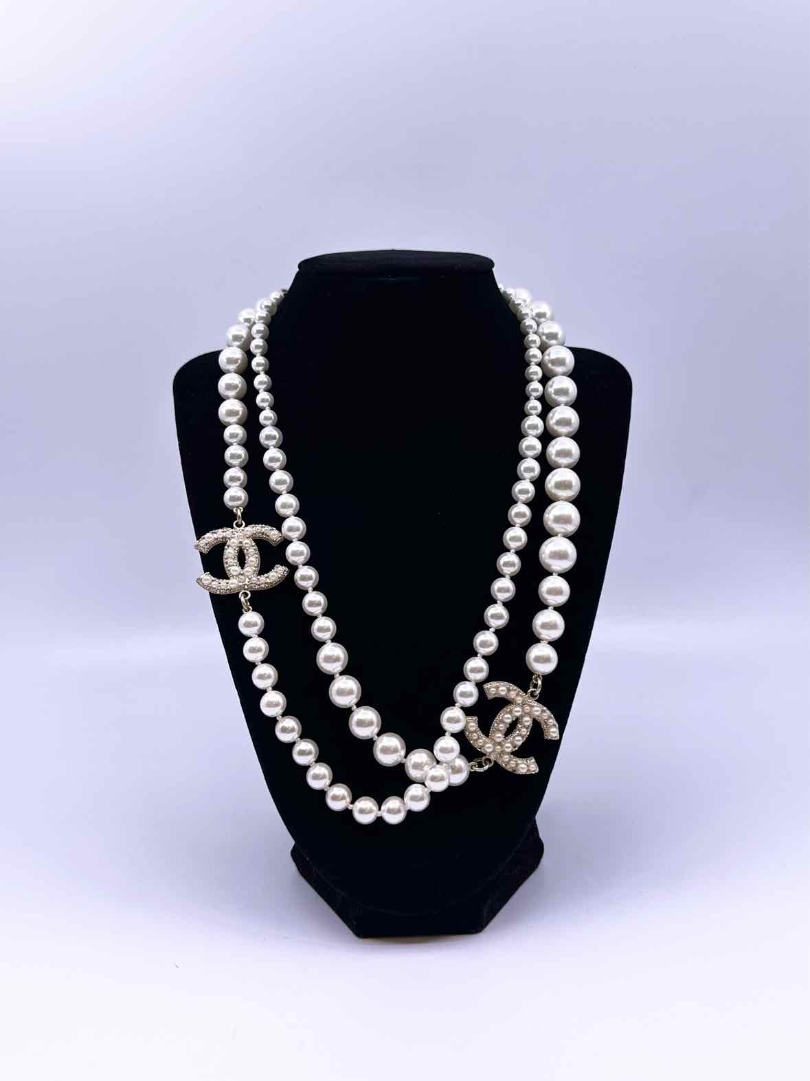 Autumn 2013 W/ BOX Gold CC Graduated opera length Pearl Necklace. 100 Yr Anniversary, Limited Edition. 2 large CC's with pearls and rhinestones.