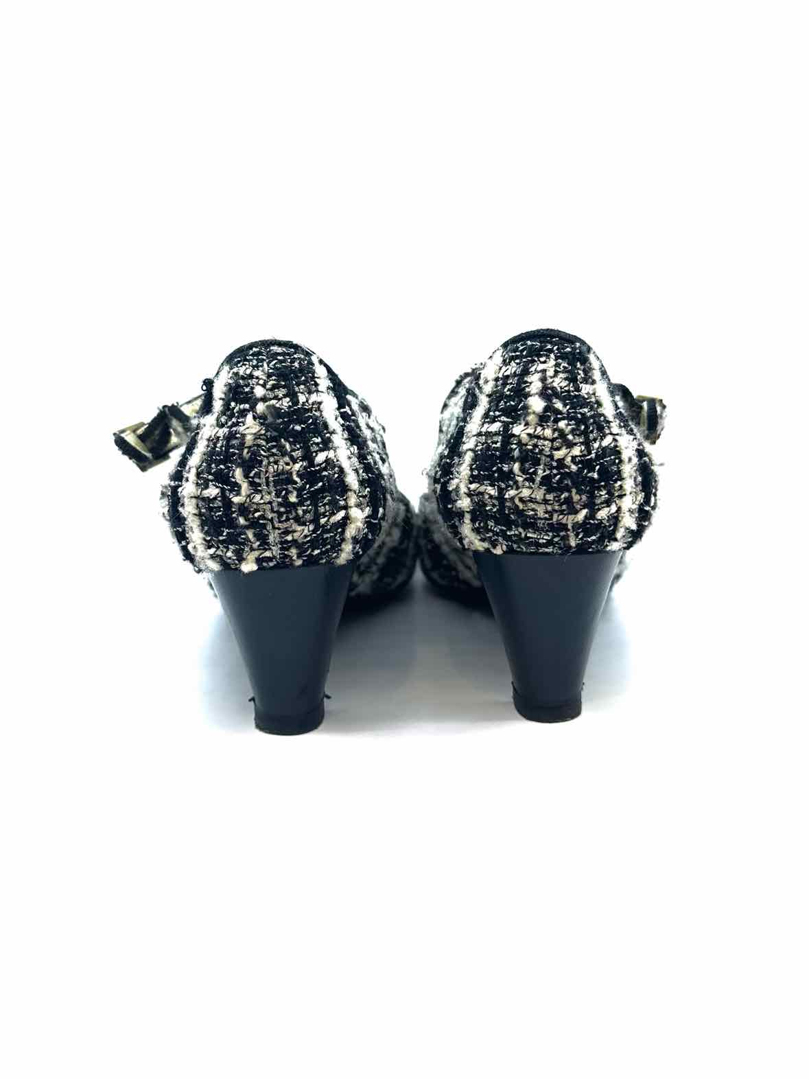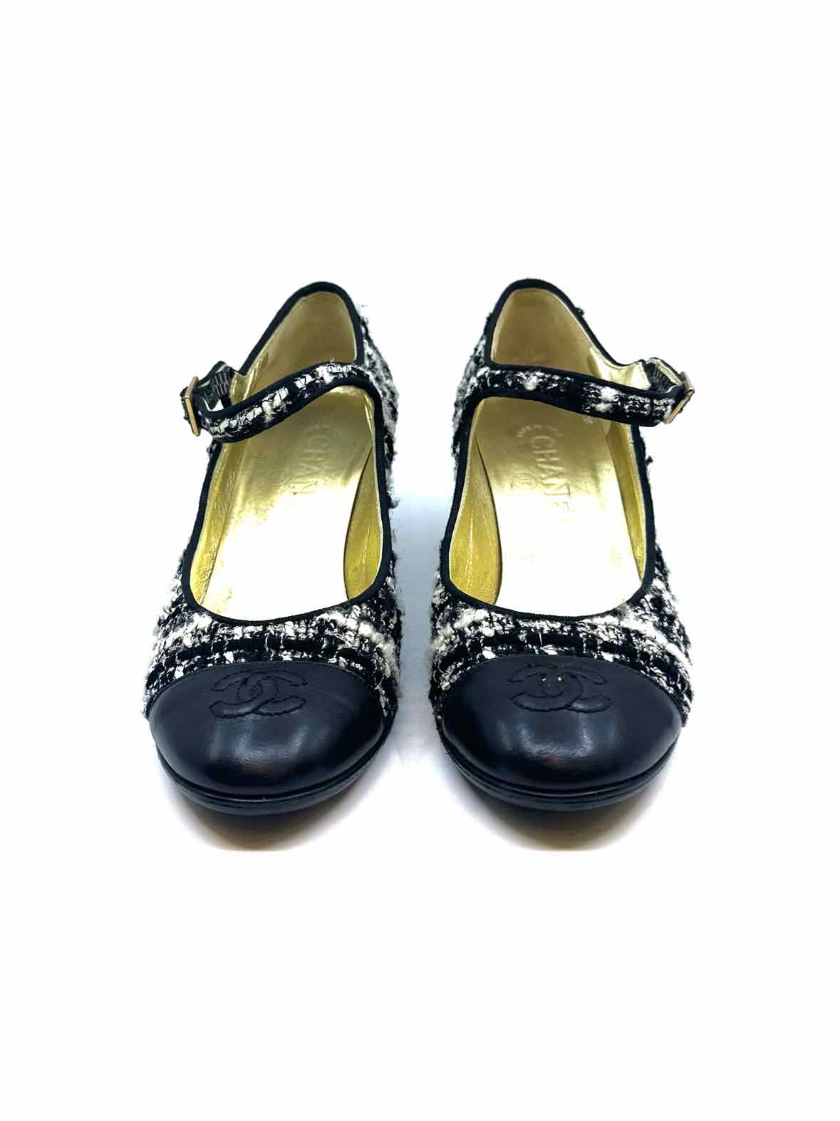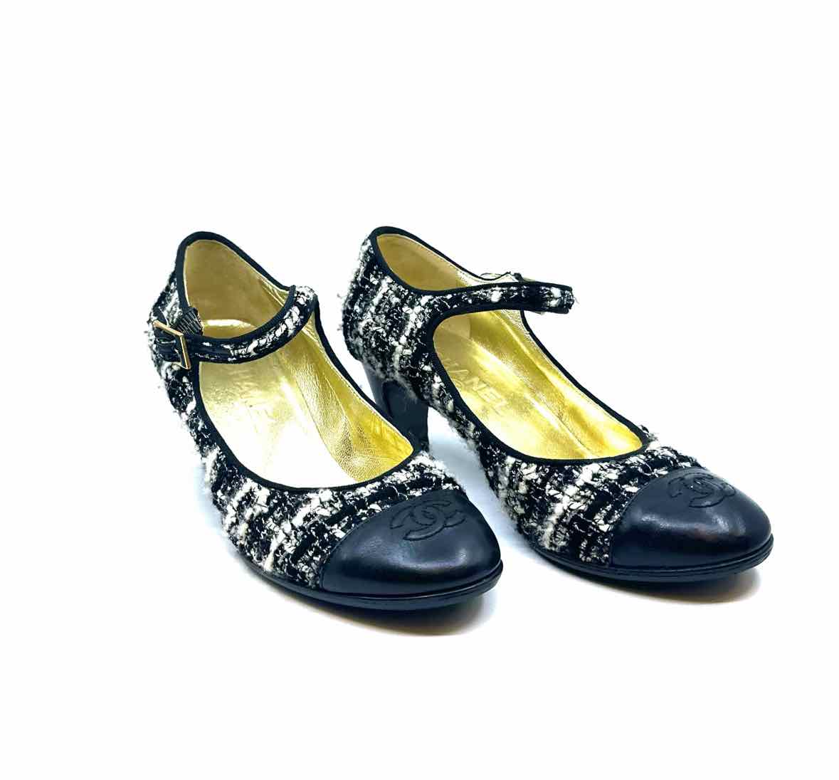 Black leather cap toe w/ logo, mary jane strap w/ gold buckle.