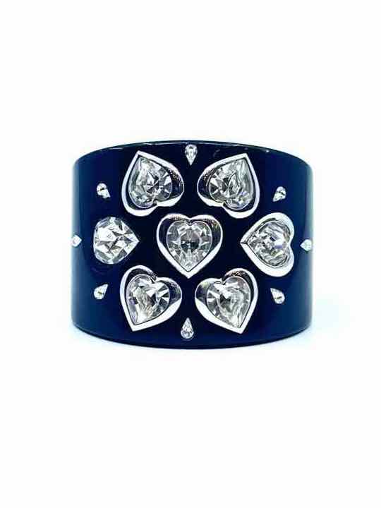large rhinestone hearts on silver frame wide resin cuff