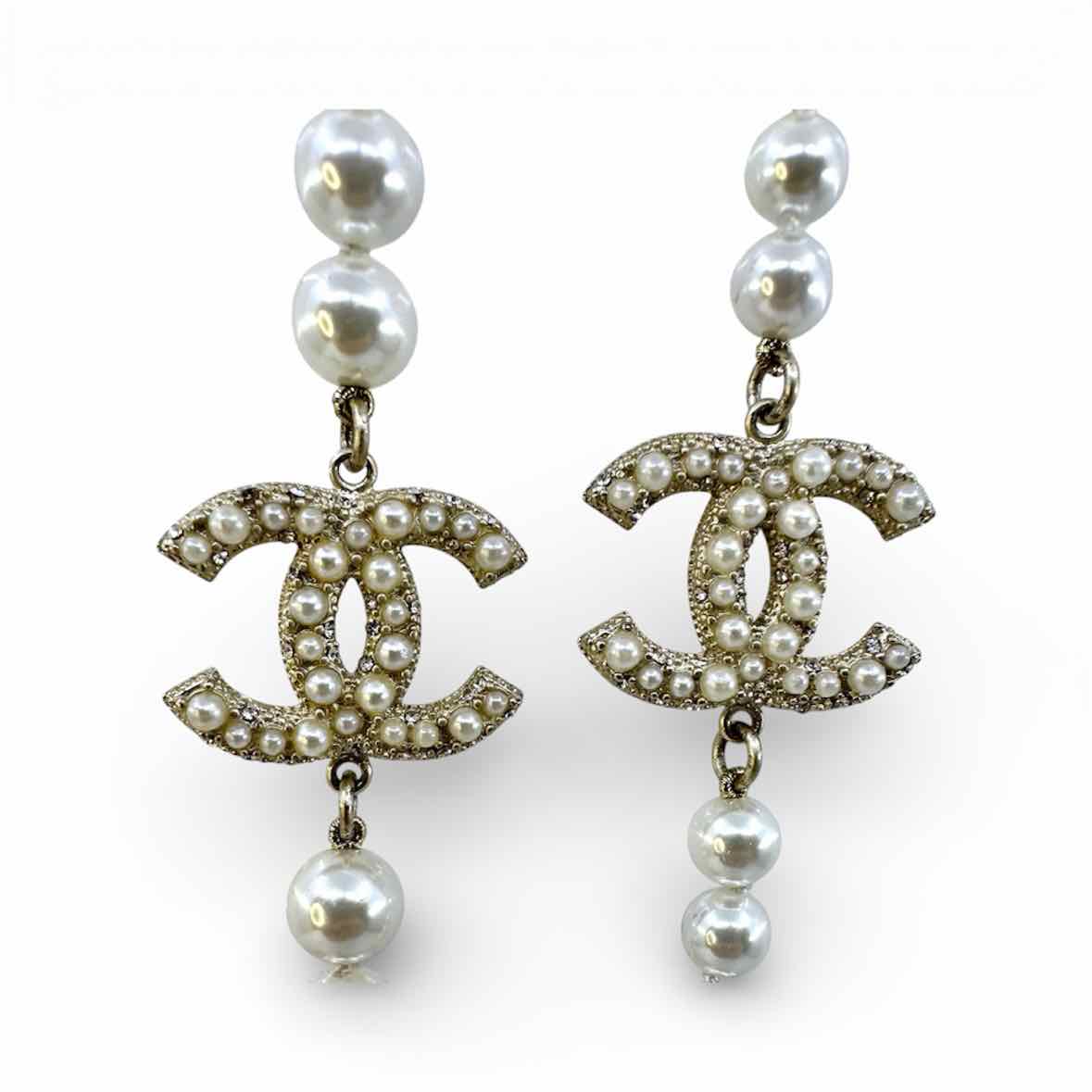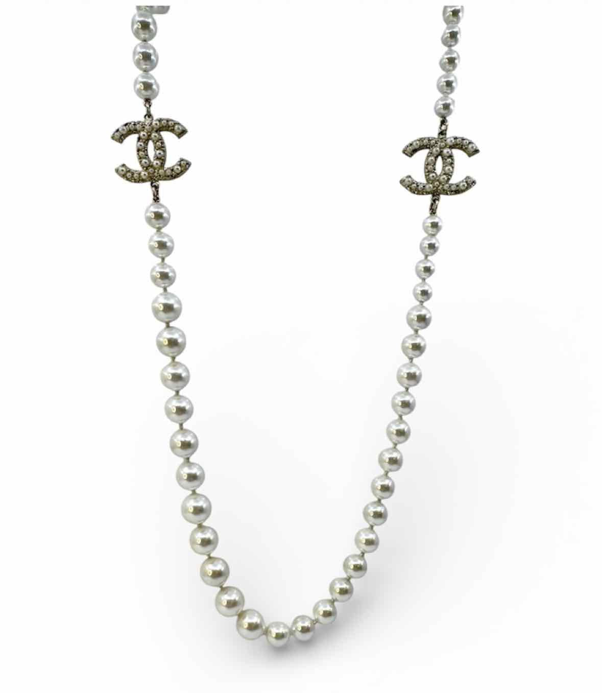 Autumn 2013 W/ BOX Gold CC Graduated opera length Pearl Necklace. 100 Yr Anniversary, Limited Edition. 2 large CC's with pearls and rhinestones.