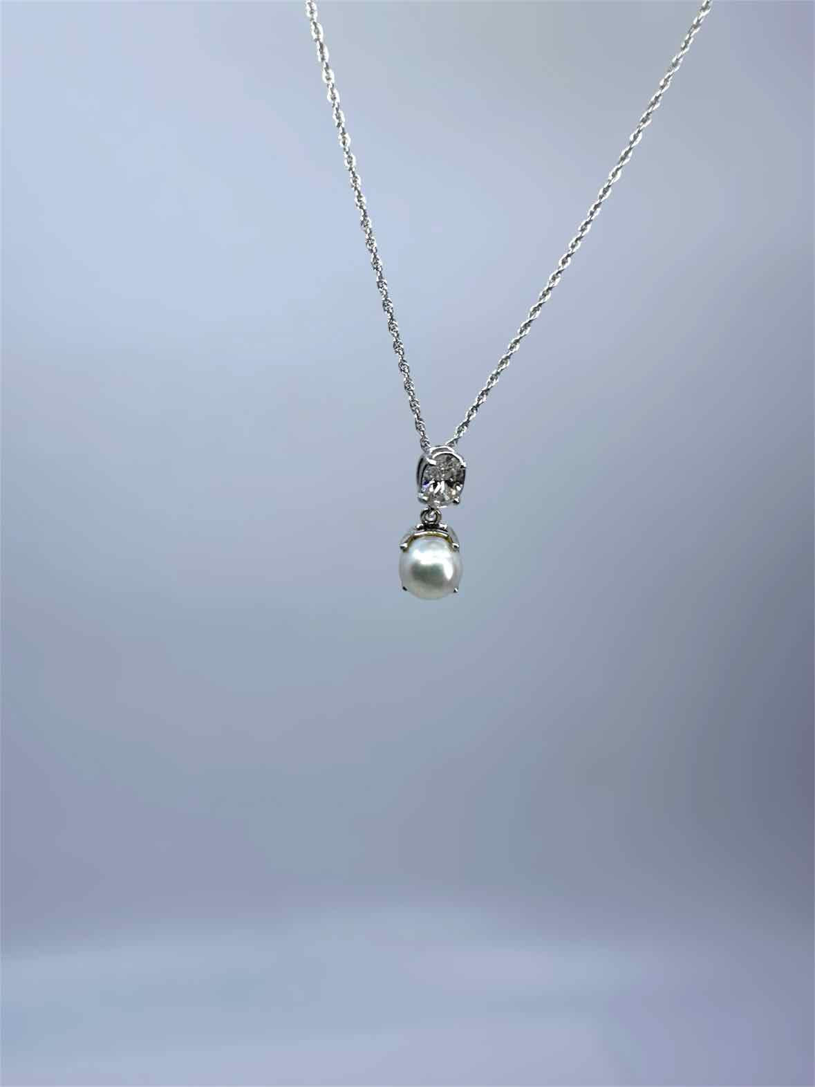 single white pearl with oval diamond top pendant on white gold chain 6.2g