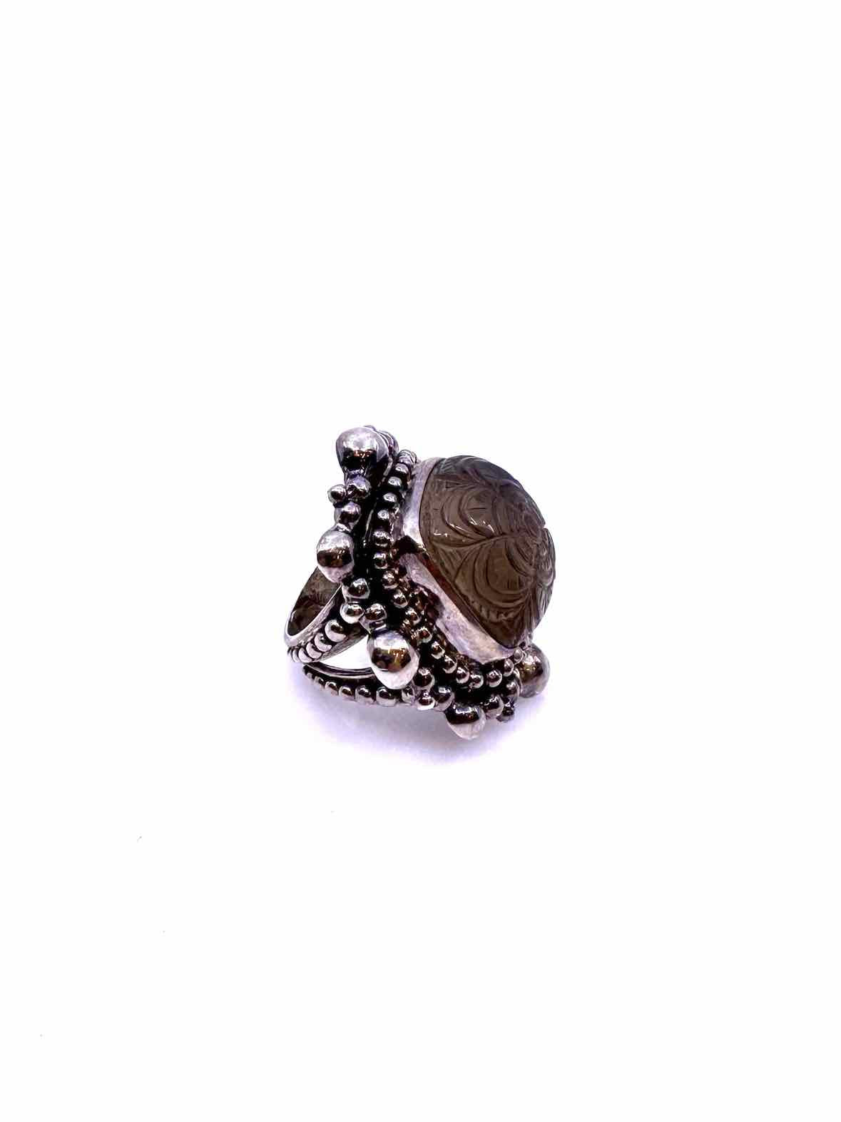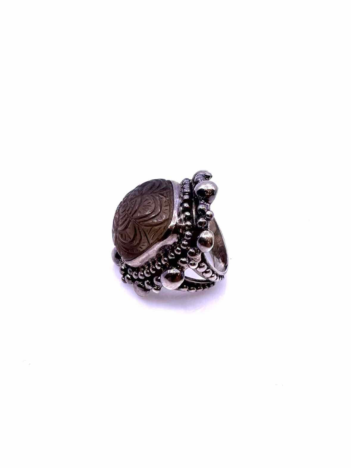carved large carved cushion cut smoky quartz on silver beaded frame