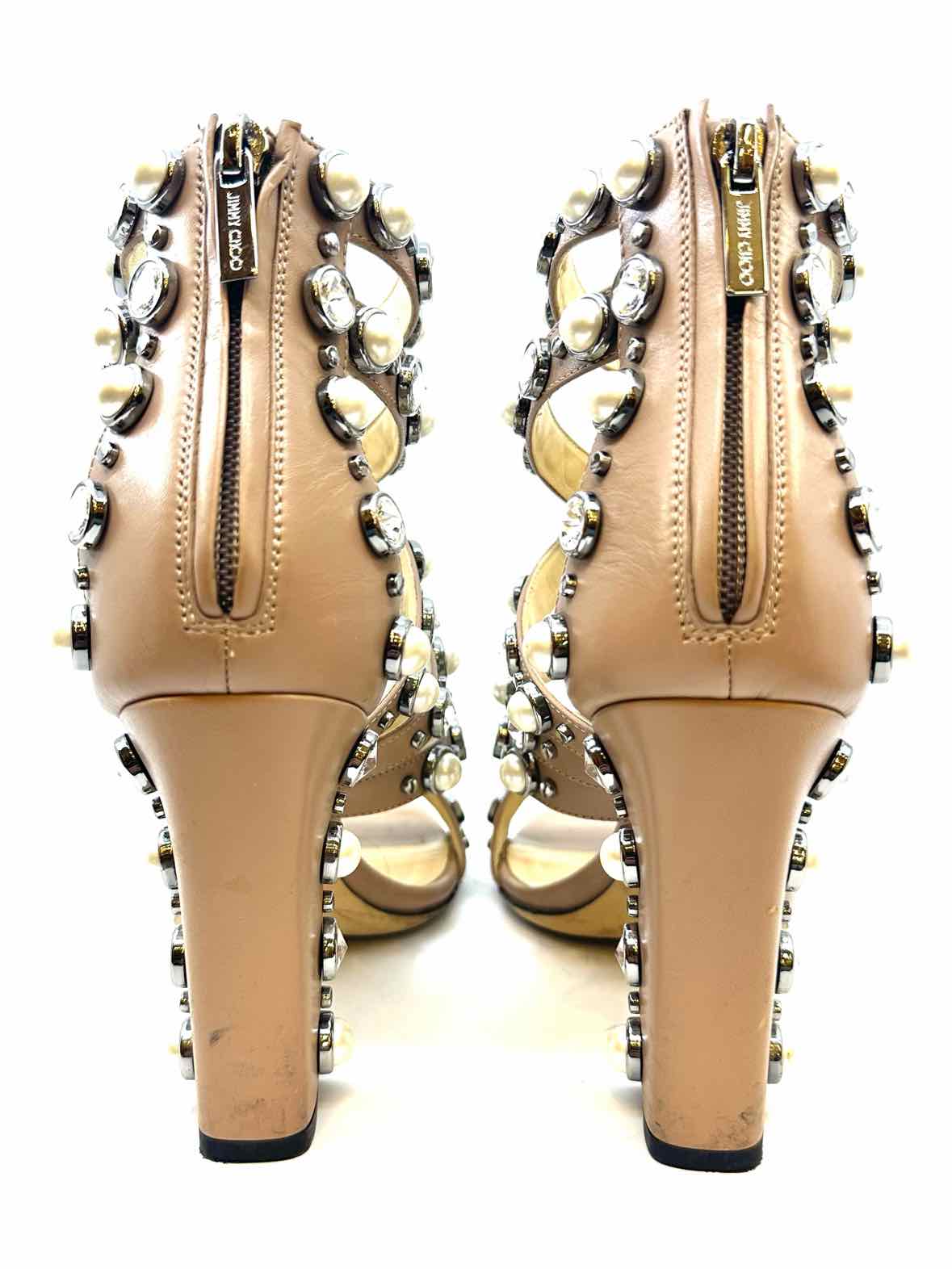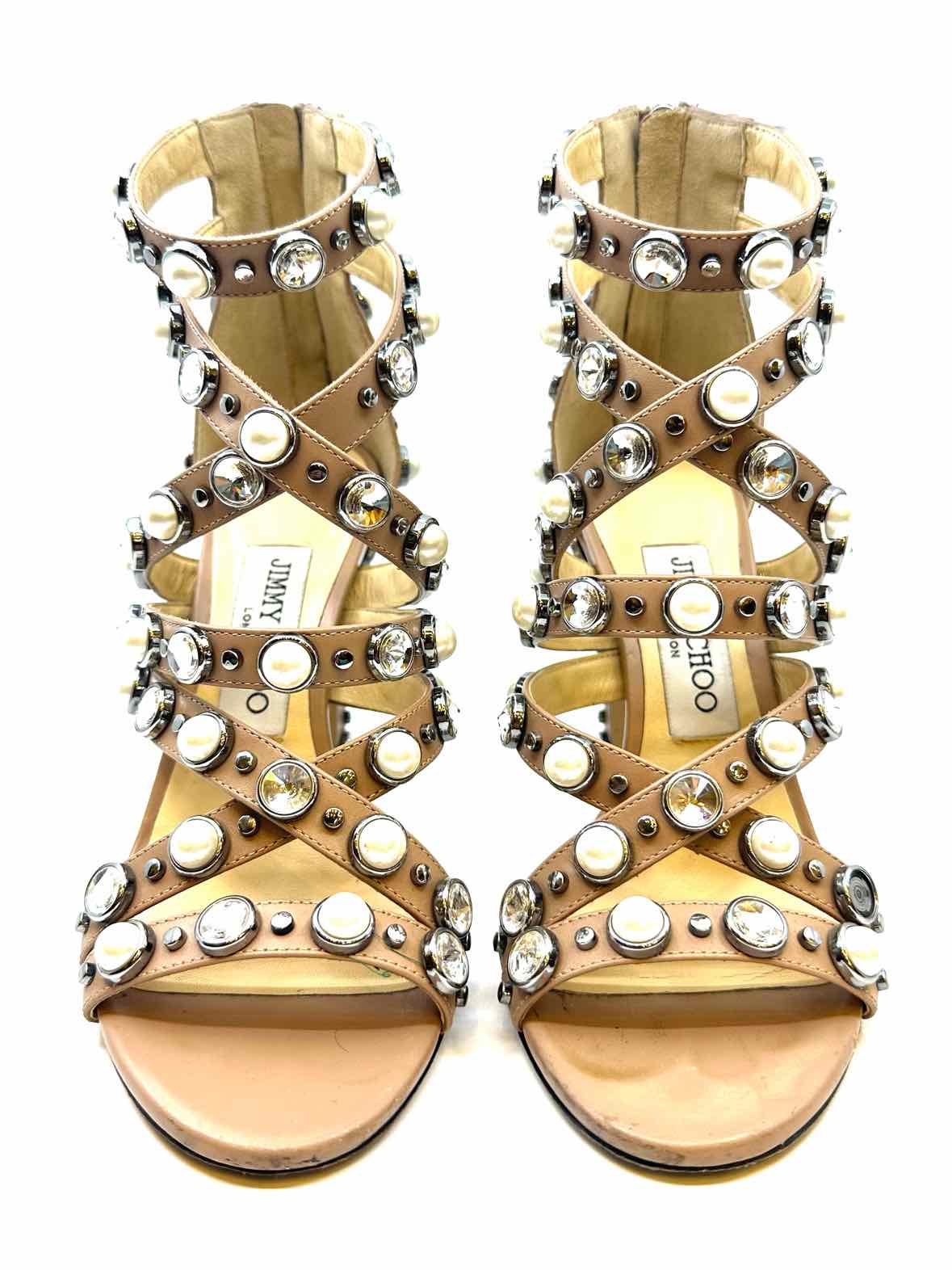 Strappy with rhinestones and pearl embellish, back zipper, mid stacked heel w/box