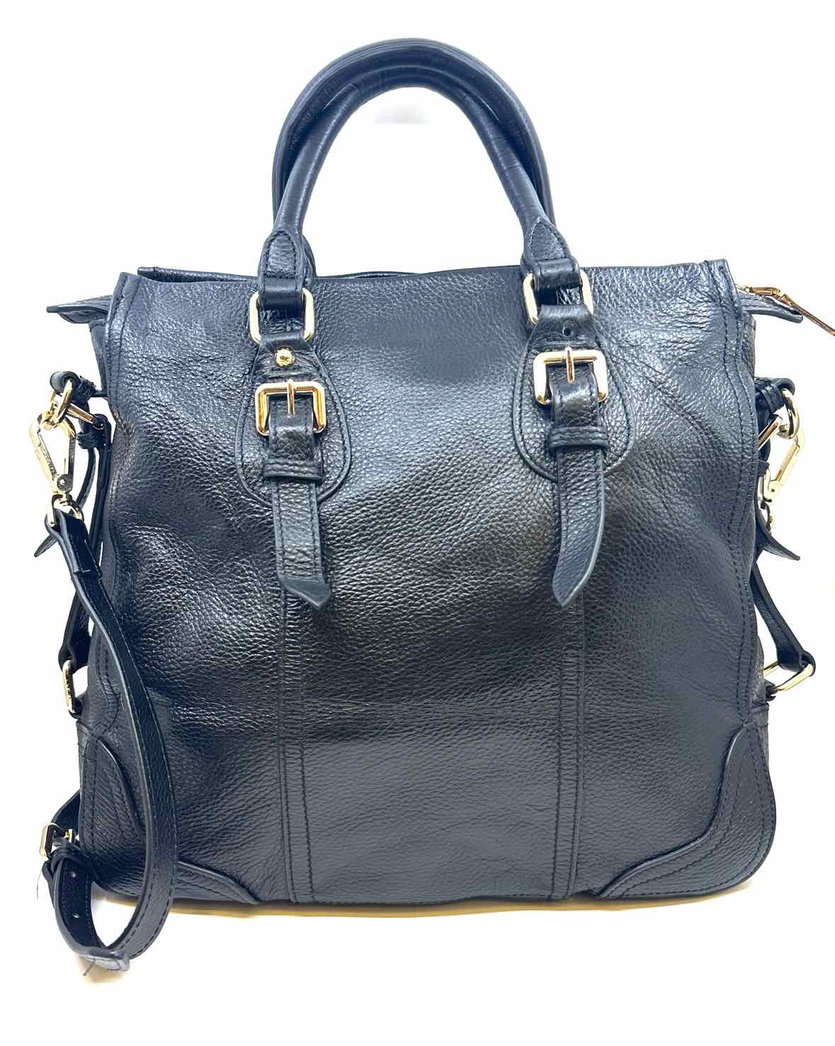 Squared, dbl top handles w/ crossbody. Gold hardware