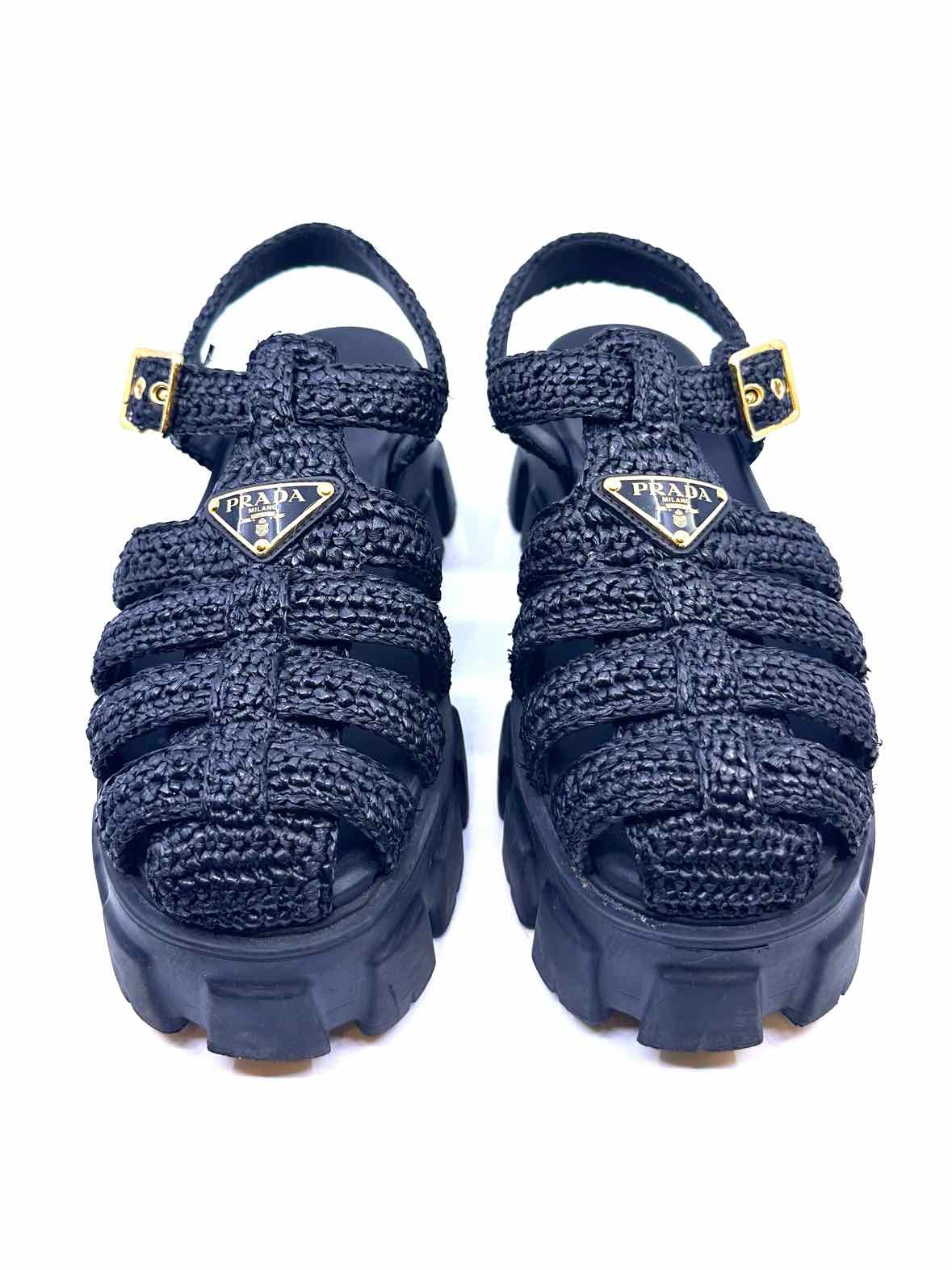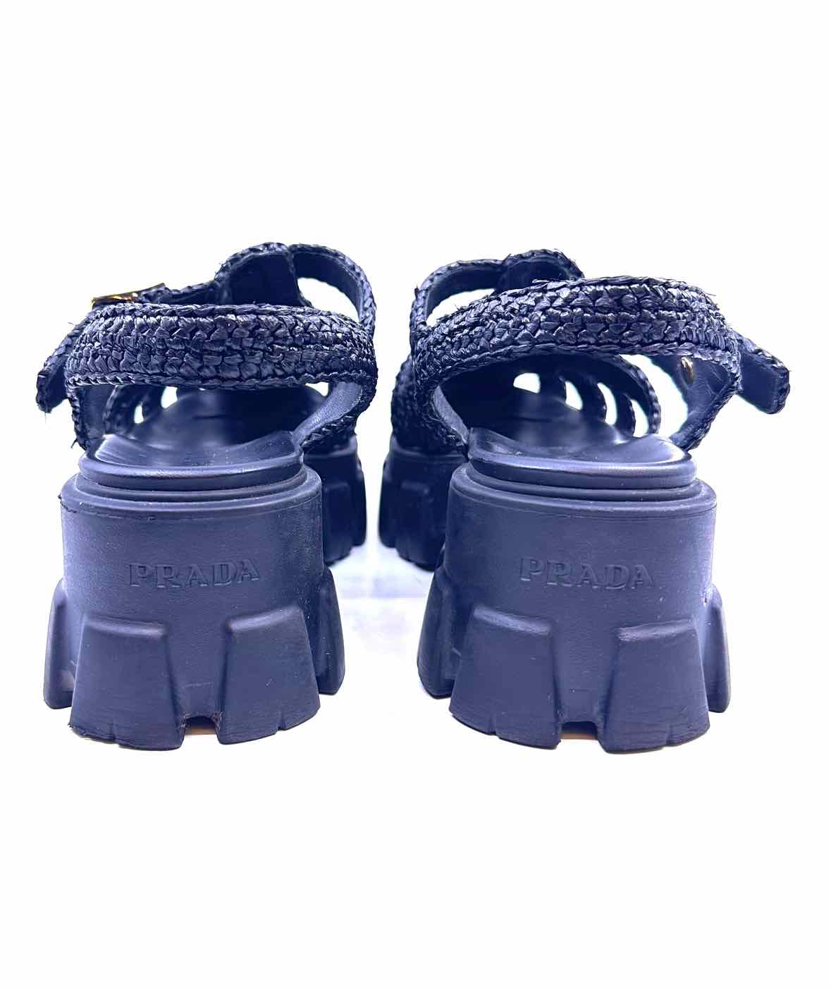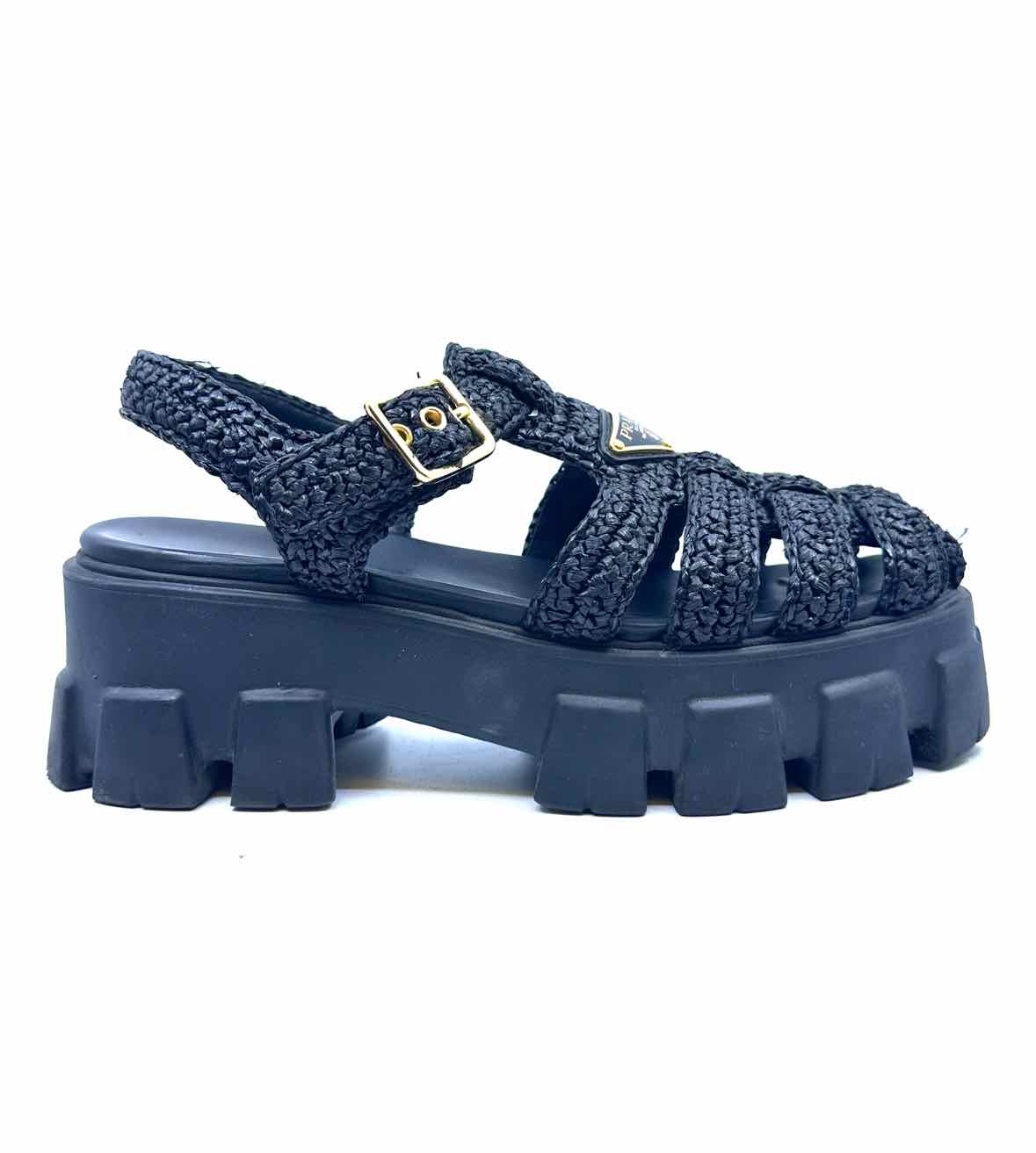 PRADA Monolith Size 8 Black Straw Woven Sandals