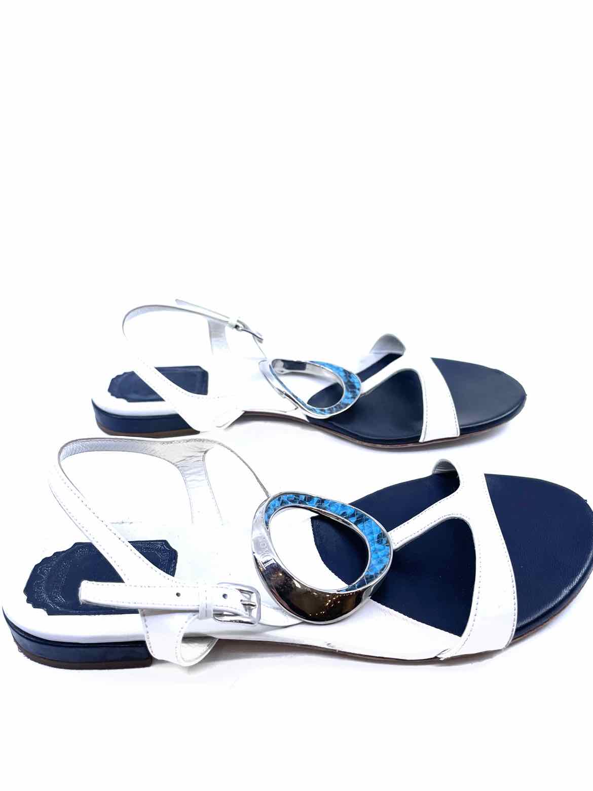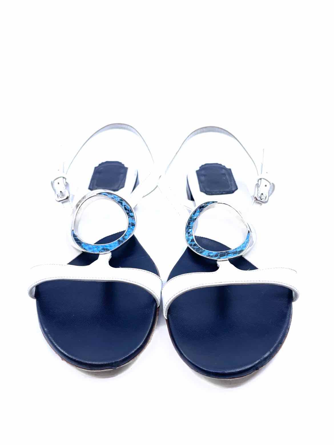 Flat, open toe, circular silver ring w/ aqua snakeskin pattern.