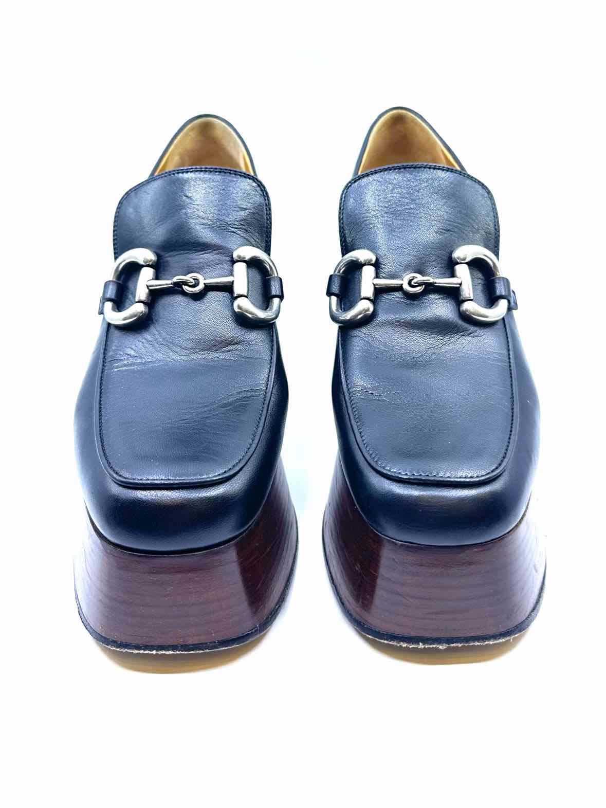 W/BOX Squared toe, silver horsebit, tall brown block heel w/ brown platform.