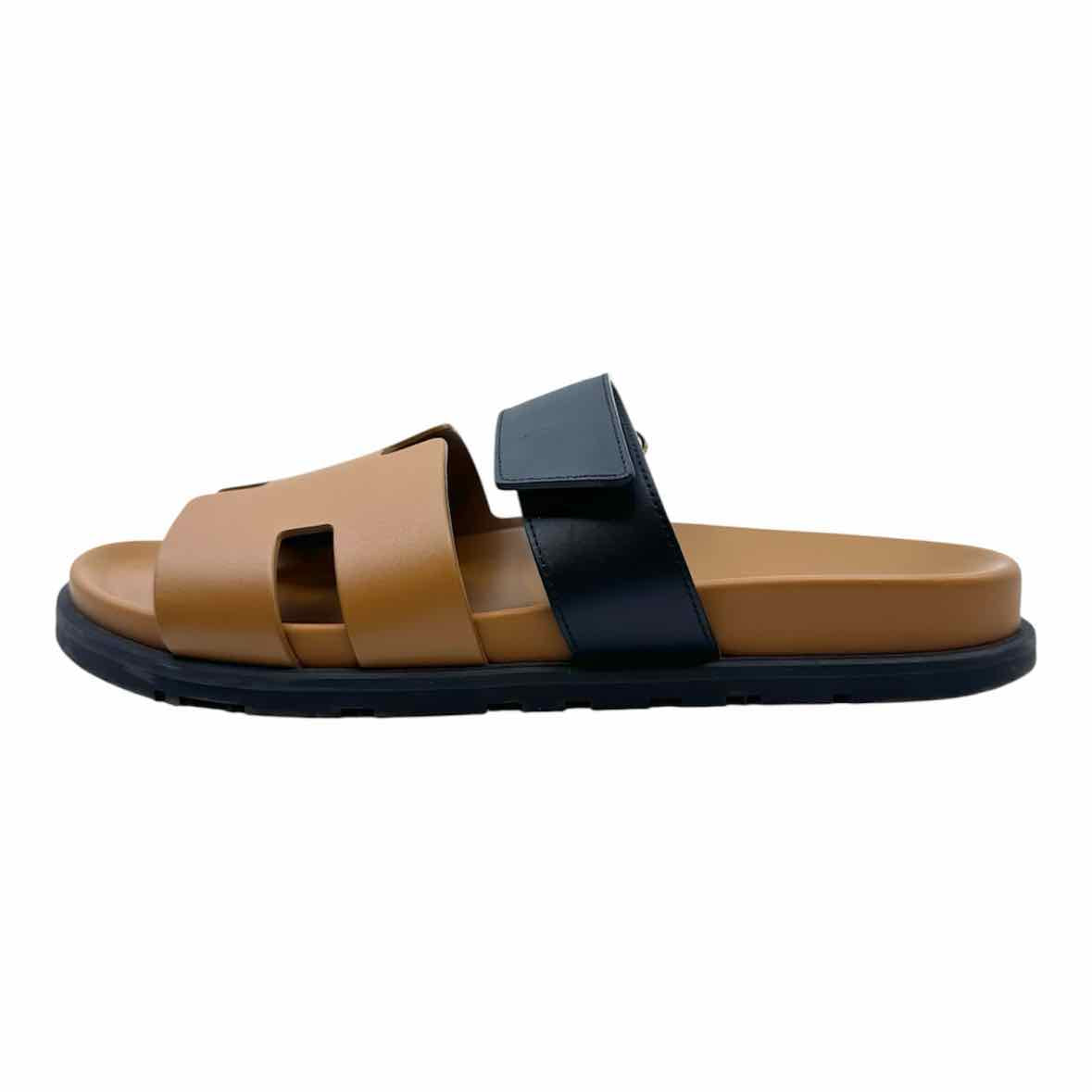 HERMES chypre Size 9 Camel, Black Leather Solid Sandals