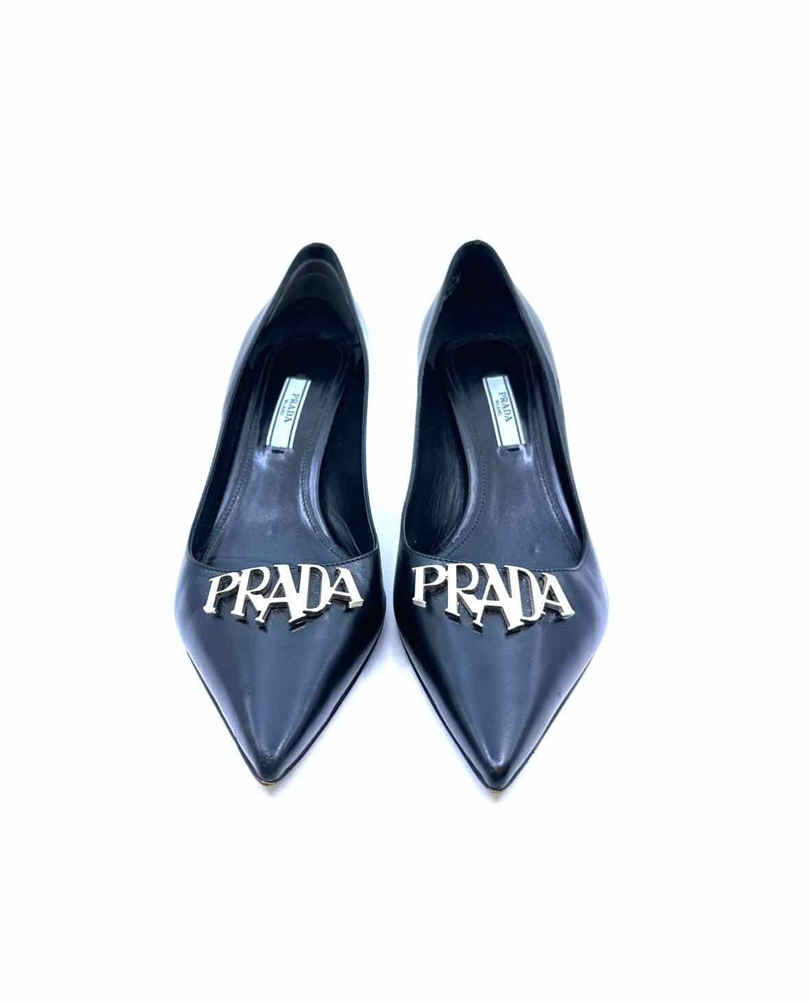 Pointed toe, silver PRADA log on toe, silver kitten heel.