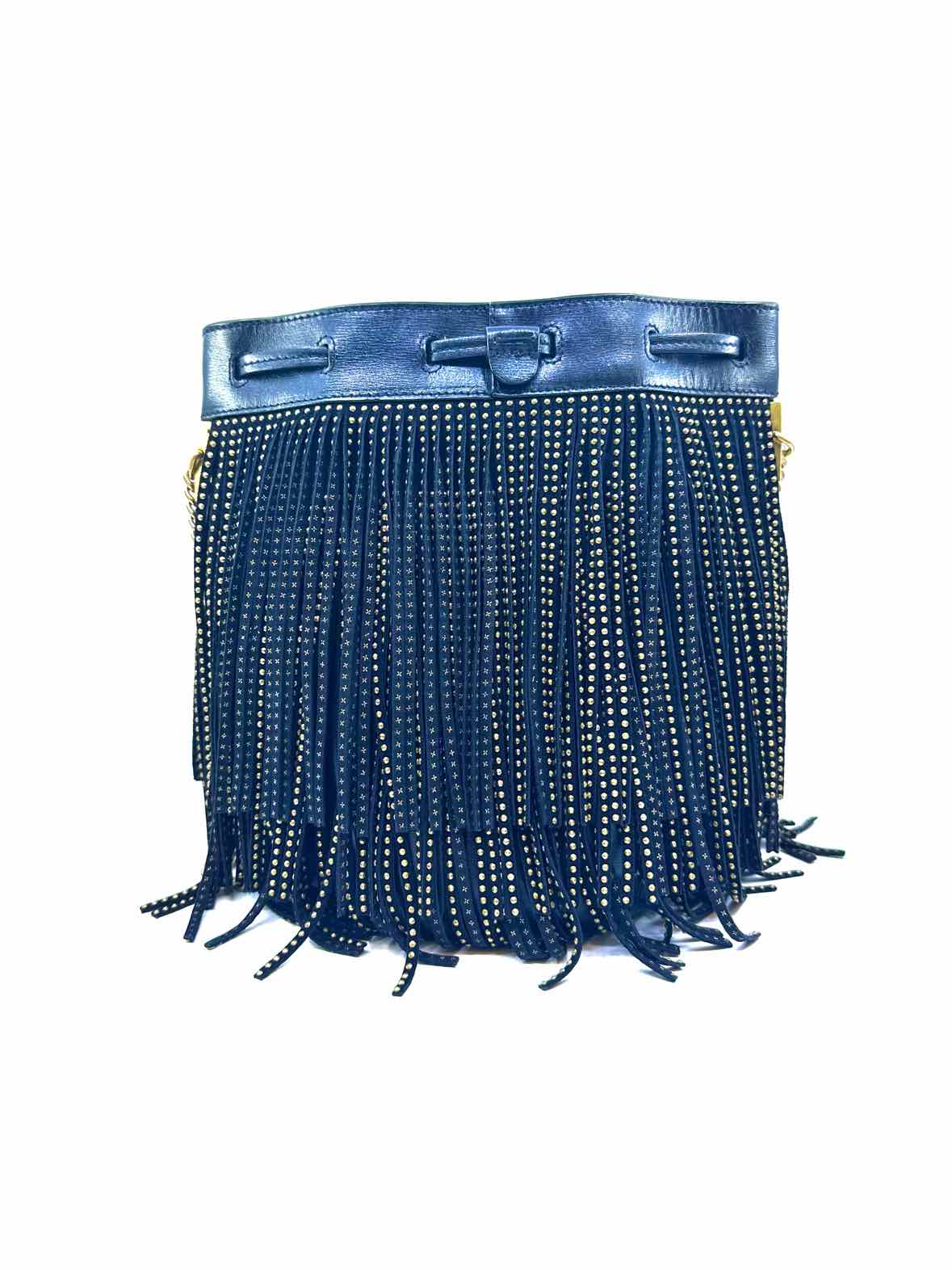 Small, fringed throughout w/ brass studs, bucket w/ drawstring, brass crossbody strap.